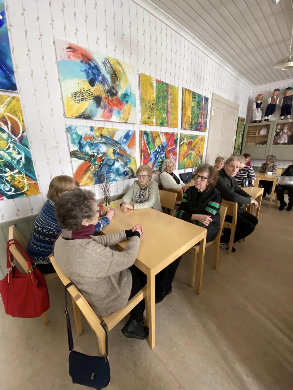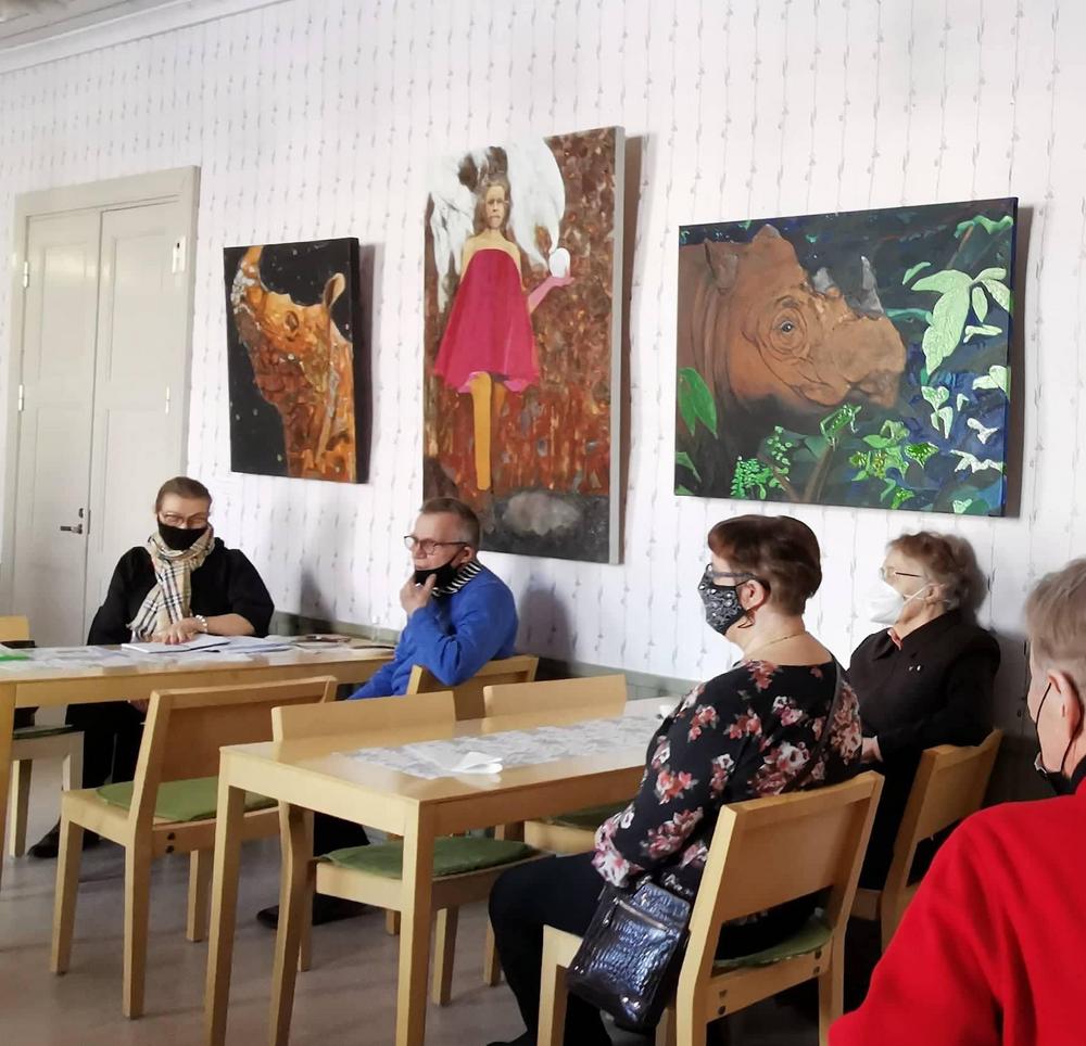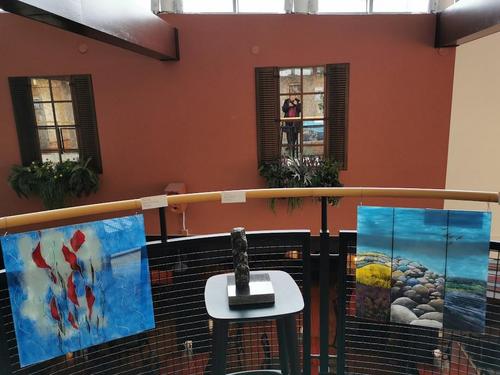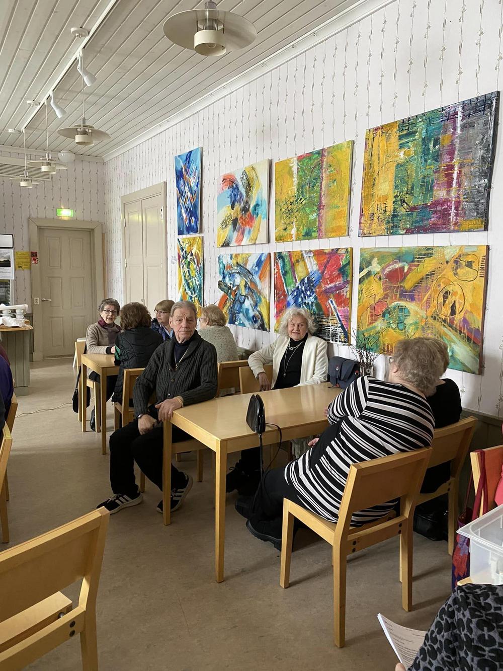 Valokuvissa näkyy seinillä kuvataiteilija Riitta Ali-Rekolan upeita töitä. Näyttelyn avajaiset oli maanantaina. Kannattaa käydä ihastelemassa hienoa taidetta!!!