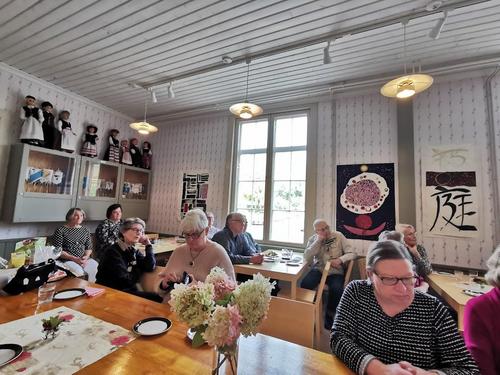 Aurinkoinen sää siivitti Seinäjoen kulttuurimatkaa tiistaina 27.9.2022. Upea, mielenkiintoinen reissu Timo Tuomiston luotettavassa kyydityksessä. Apila-kirjastossa saimme kuulla oppaan kertomana kirjastosta. Joimme herkulliset aamukahvit siellä. Siirryimme Aalto-kirjaston puolelle ihailemaan Aallon rakennuskulttuuria, kalusteita ja ihania Aalto-lamppuja, jotka kaikki oli käsin entisöity suuressa remontissa. Aaltokeskuksessa tutustuimme kaupungintaloon, Lakeuden Ristin kirkkoon ja kaupunginteatteriin. Seuraavaksi siirryimme suojeluskuntamuseoon, Mannerheim-ja Lottamuseoon. Mahtava paikka, jossa olisi voinut viettää aikaa pidempäänkin. Ravintola Almassa söimme herkullisen lounaan ja kuulimme esityksen talon historiasta.Vielä vierailu hienossa Seinäjoen taidehallissa Kalevan Navetassa, jossa tutustuimme kahteen eri näyttelyyn. Juustoportin kautta tyytyväisinä takaisin kotiin! Kiitos kaikille mukana olleille!