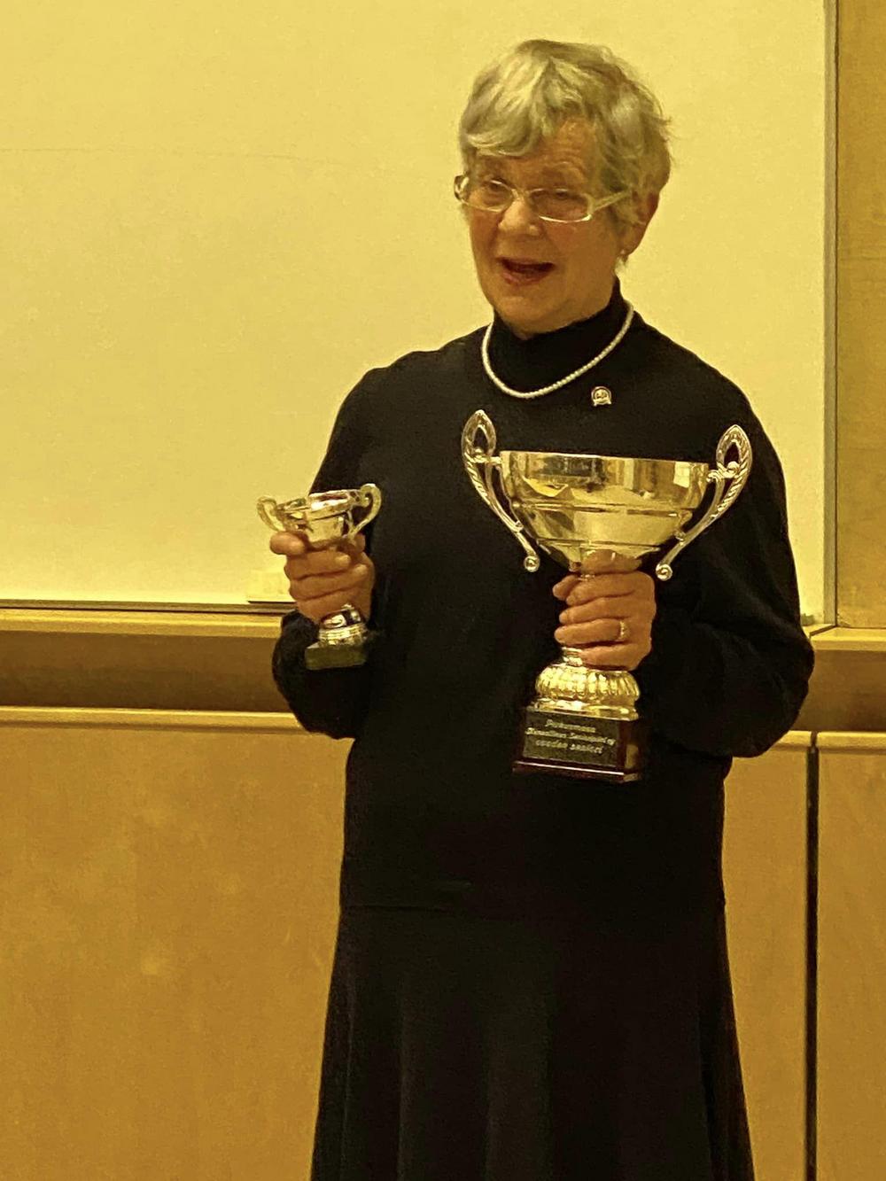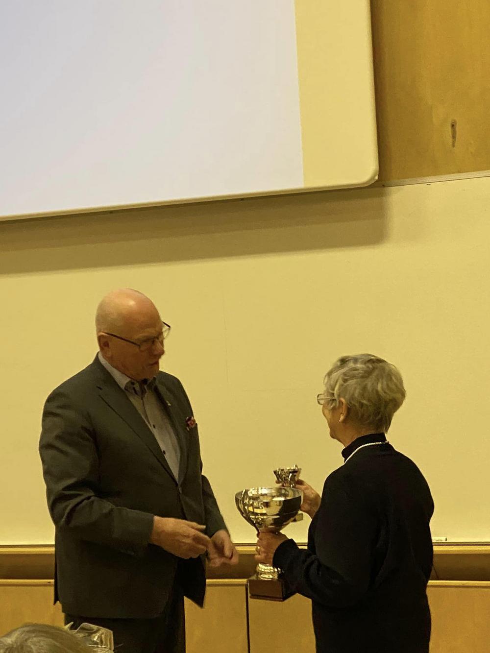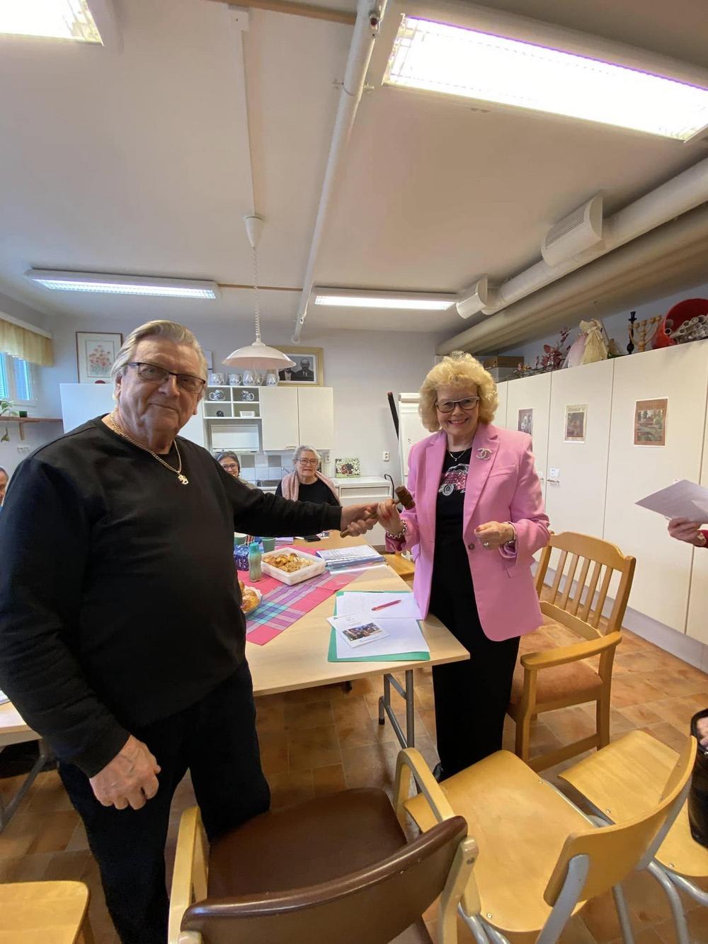 Uusi puheenjohtaja Terttu Martikainen sai lahjaksi Pentti Hakalalta puheenjohtajan nuijan. Pentti valittiin kokouksessa uudeksi varapuheenjohtajaksi.