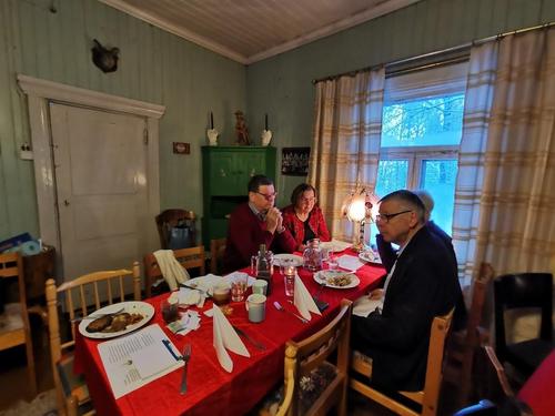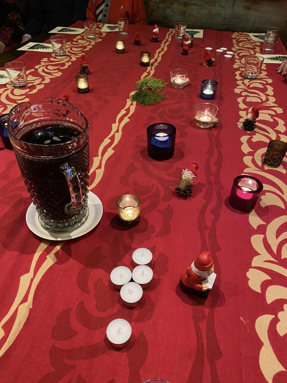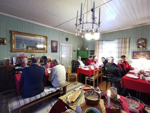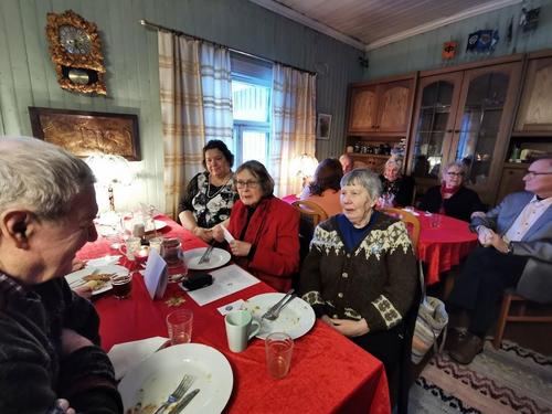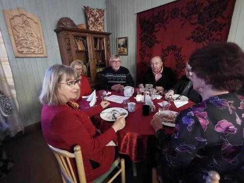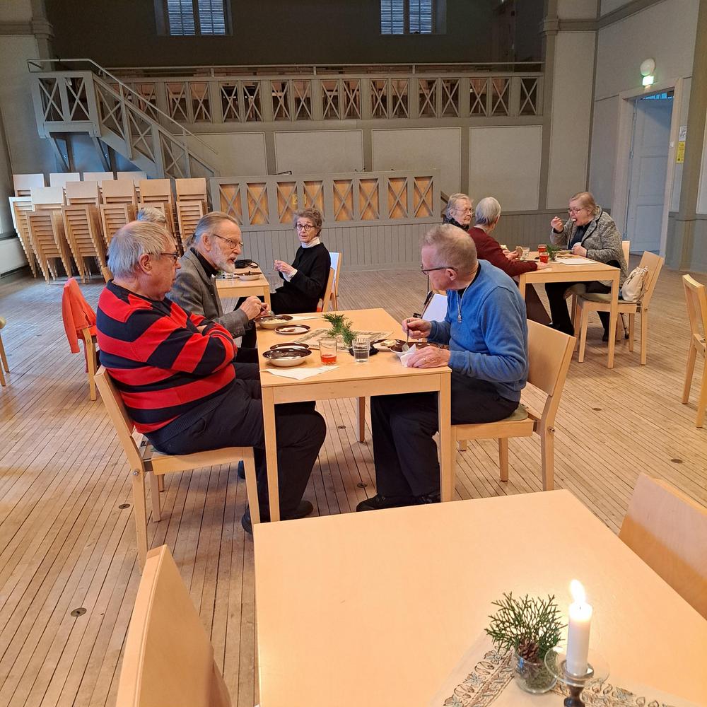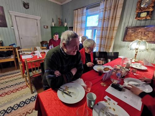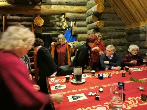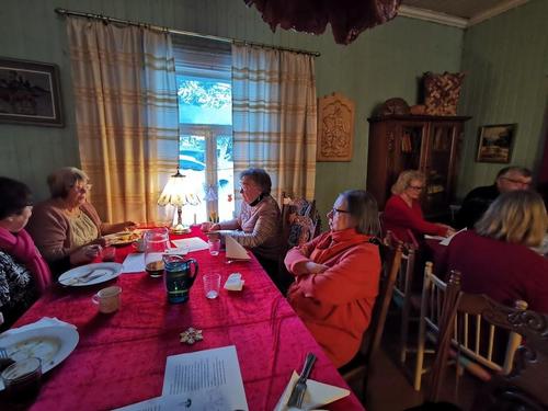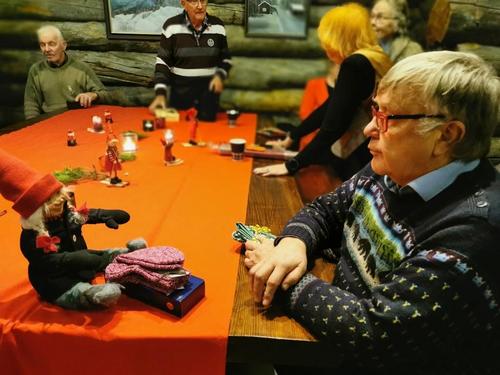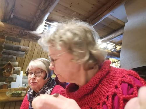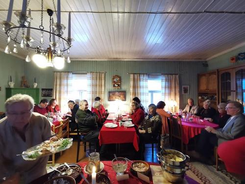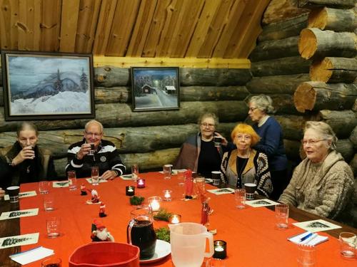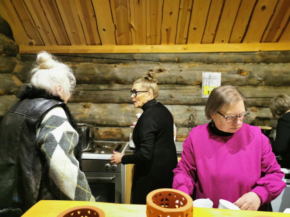 Koska teemana oli pikkupikkujoulu, saimme aluksi kuumaa glögiä, kiitos Leila L.!! Joululaulukin laulettiin tässä välissä! Nautimme herkullista kalakeittoa ja rieskoja.