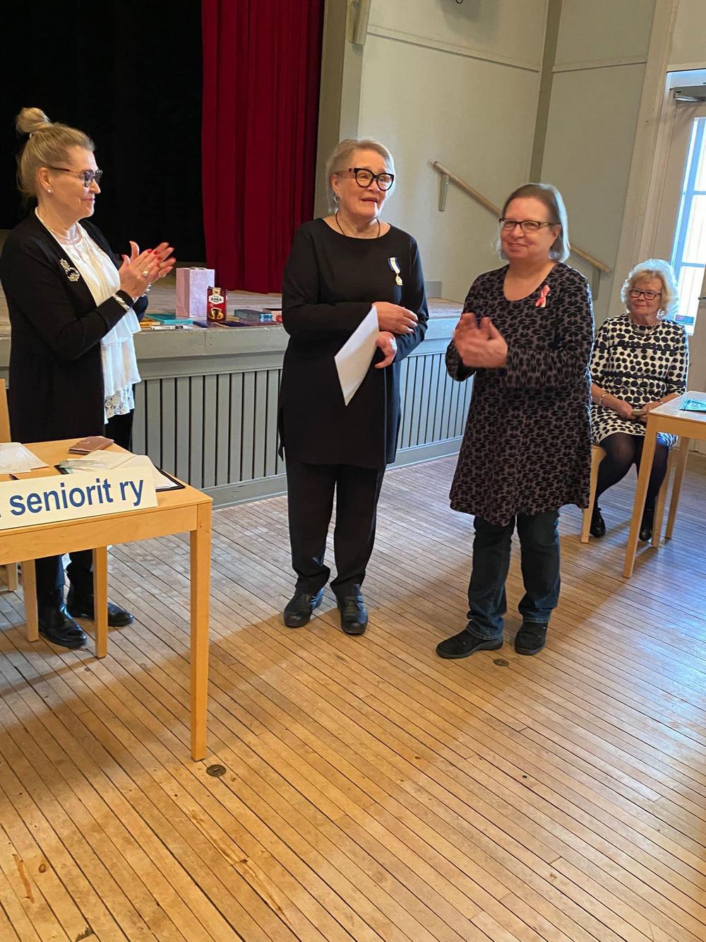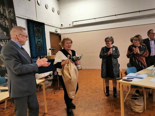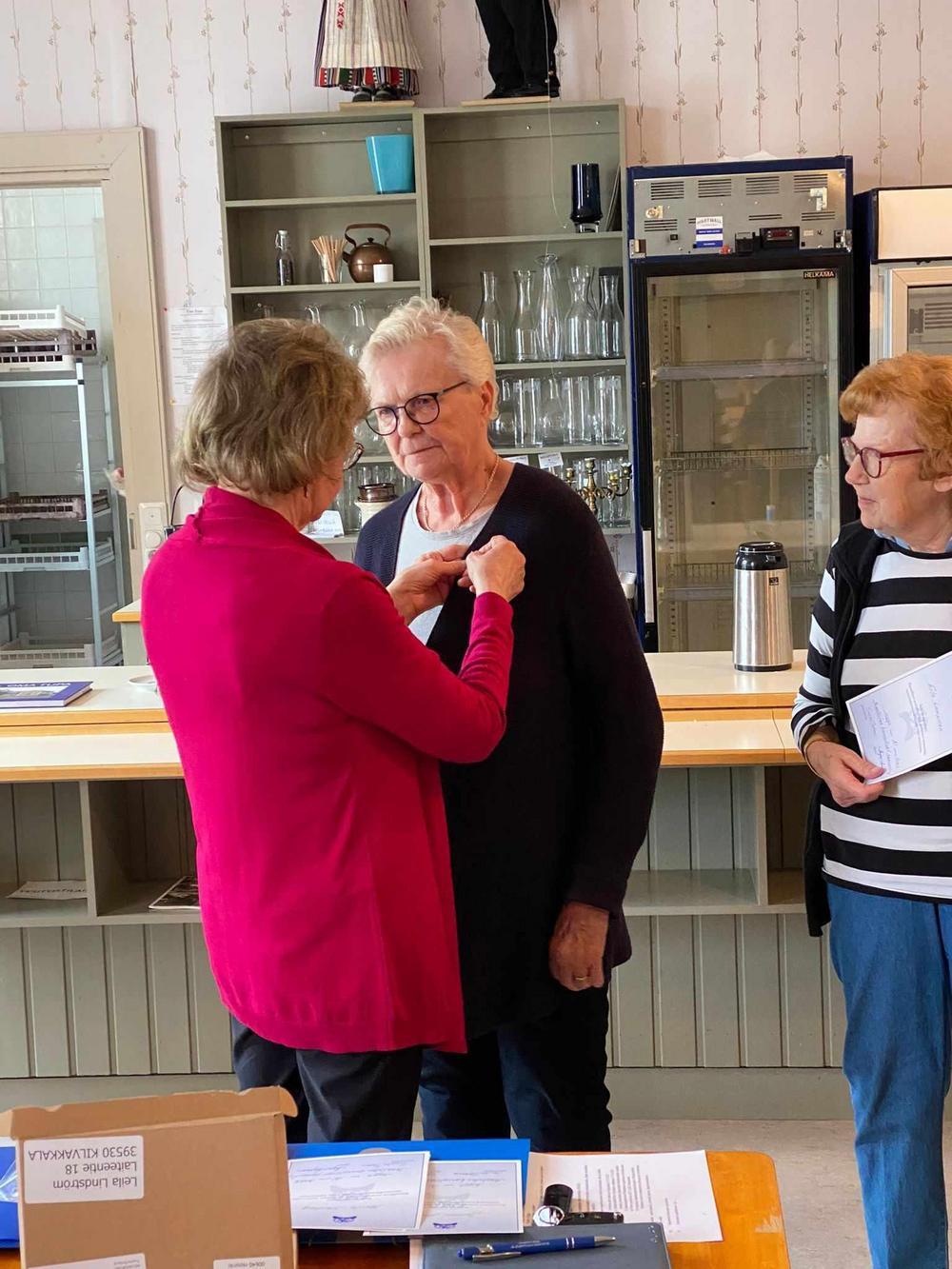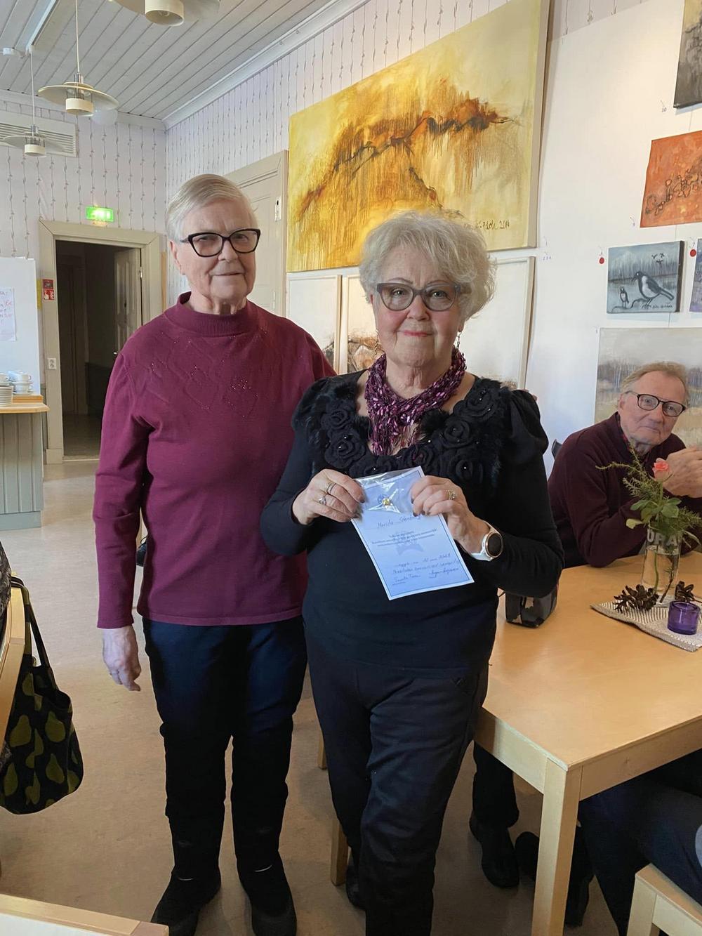 Puheenjohtaja Tuula Talonen luovutti pronssisen ansiomerkin Marita Stenbergille.