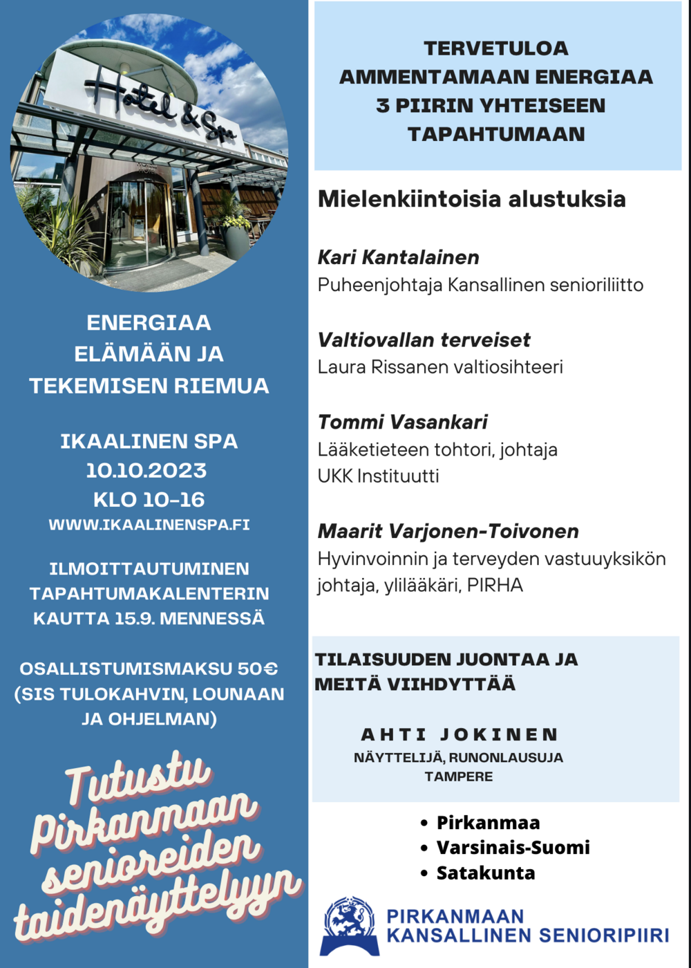 Kokoonnuimme kuulemaan torstaina 27.4.2023 klo 12.00 Omalle Tuvalle lääkintöneuvos, aluehallituksen pj Kari-Matti Hiltunen näkemyksiä otsikolla "Pirkanmaan hyvinvointialueen 117 päivää" soten vastuun siirrosta kunnilta hyvinvointi alueelle.