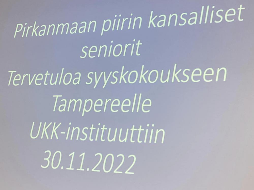 Tänään 30. marraskuu 2022 UKK-instituutissa Pirkanmaan kansallisten senioreiden piirin syyskokous!Kokouksen alussa julkistettiin piirin vuoden seniori, valkeakoskelainen Marianne Marenk. Onnea!UKK-instituutin johtaja, lääketieteen tohtori Tommi Vasankarin esitys ikäihmisen liikunnasta kiinnosti kokousväkeä, meitä ikäihmisiä!!Senioriliiton pj ja hyvinvointialueen valtuuston jäsen Anneli Taina toi Pirkanmaan hyvinvointialueen ajankohtaisia uutisia.Ruokailun ja ohjelman jälkeen varsinainen kokous saatiin sujuvasti päätökseen. Kotimatkalla olimme ”neitsytajelulla” tänään liikenteelle avatulla uudella Hämeenkyrön ohitustiellä!!