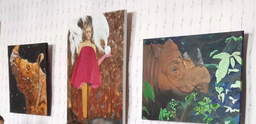 Valokuvissa näkyy seinillä kuvataiteilija Riitta Ali-Rekolan upeita töitä. Näyttelyn avajaiset oli maanantaina. Kannattaa käydä ihastelemassa hienoa taidetta!!!